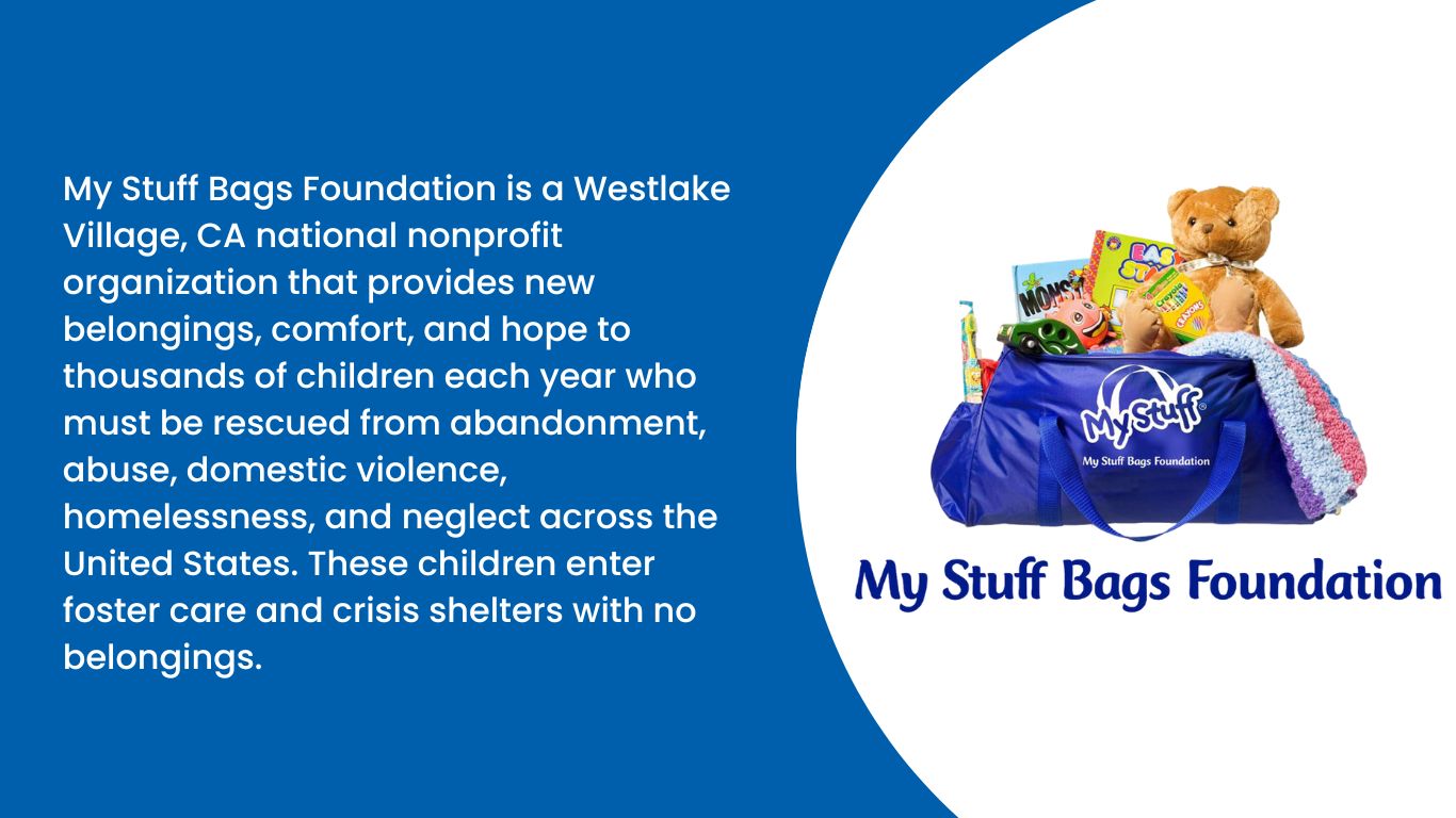 Children rescued from abuse, abandonment, domestic violence, or homelessness often leave with no belongings. My Stuff Bags Foundation provides a duffle bag of new belongings to children arriving at crisis shelters across the country, as rescuing agencies do not have the resources to provide the most basic childhood essentials. Each bag contains a stuffed animal, toys, games, books, school supplies, toiletries, and a security blanket (often handmade by people across the country). Since 1998, they have distributed bags to over 650,000 children through over 2000 agency partners.